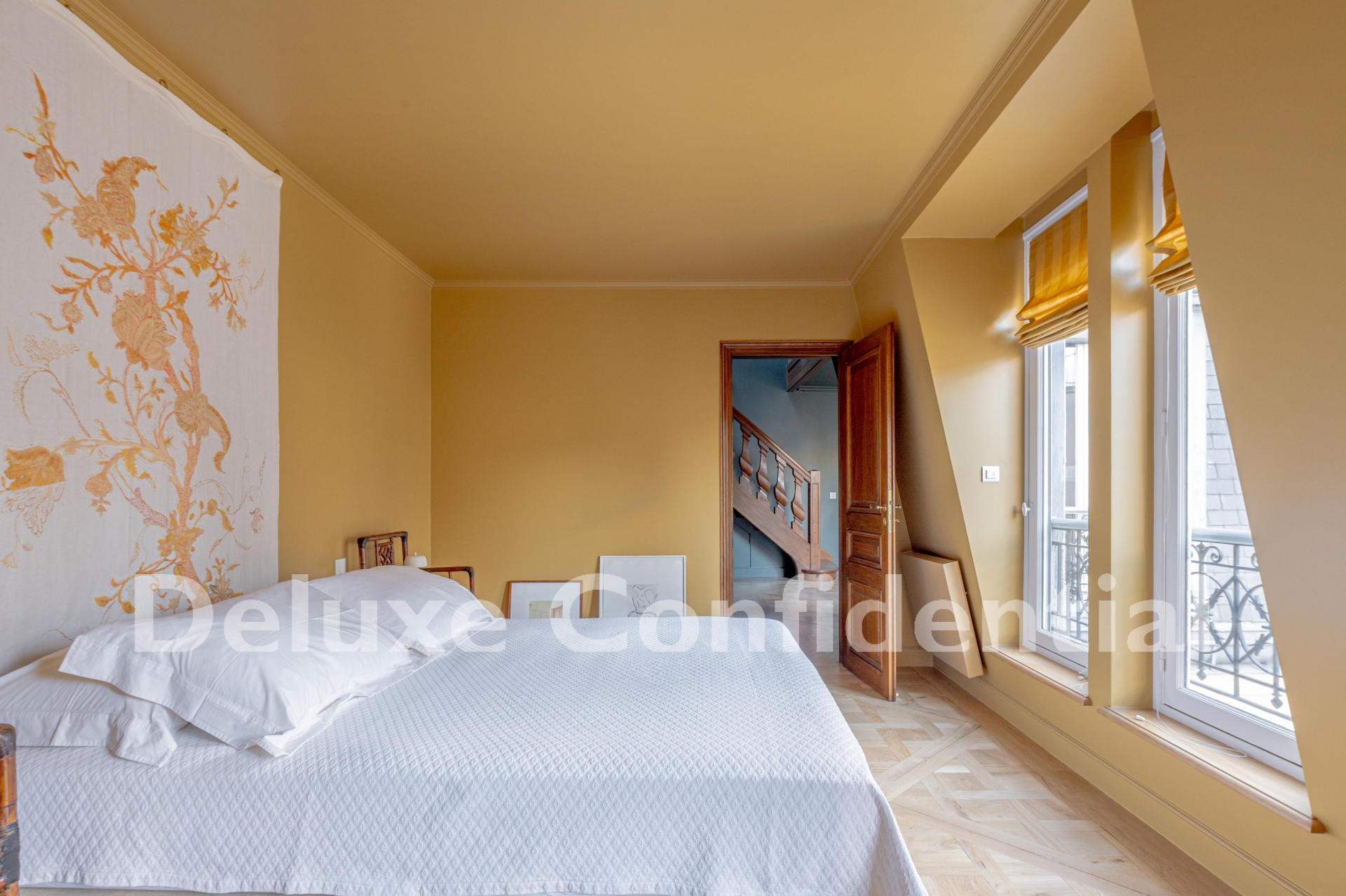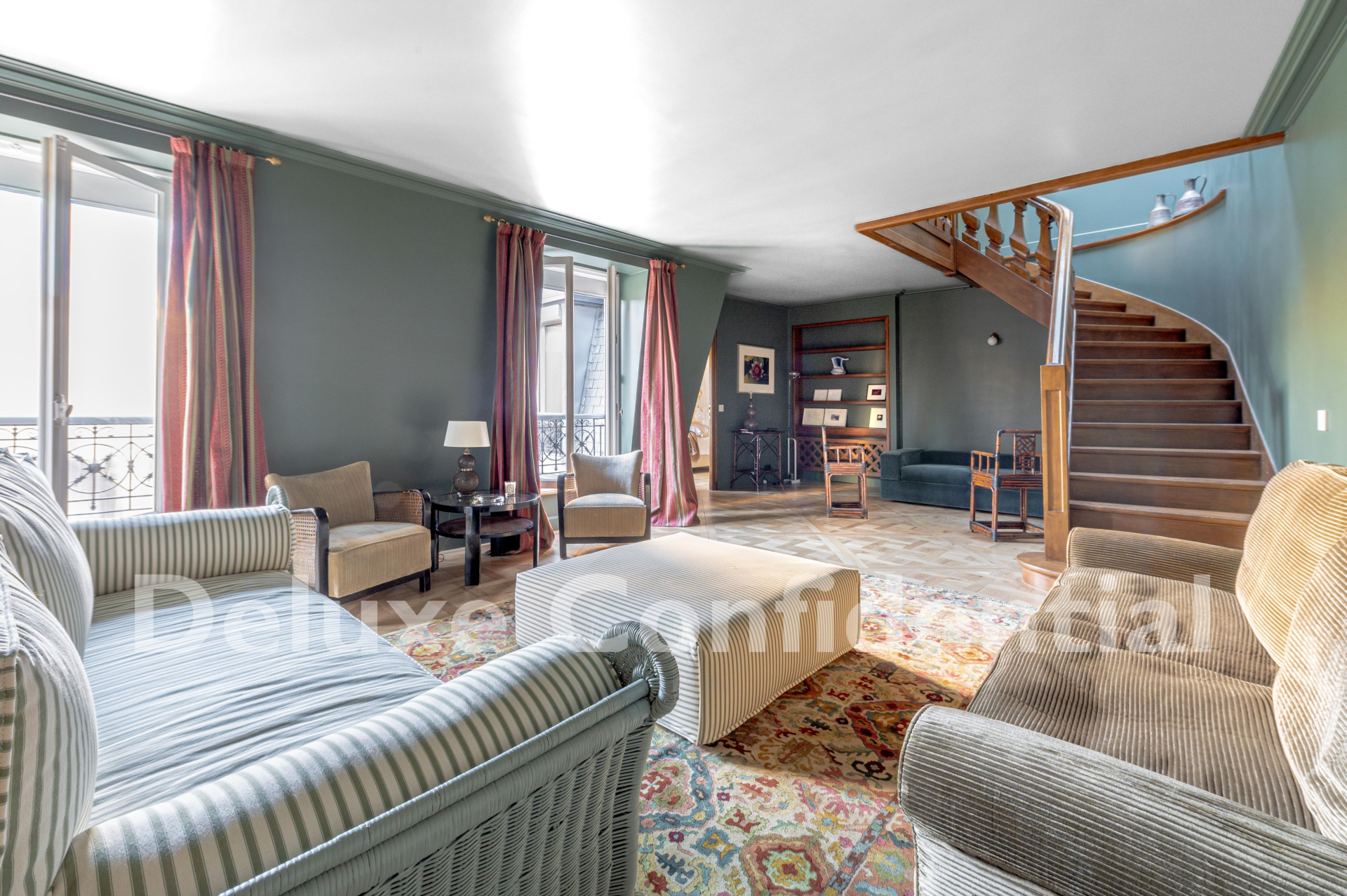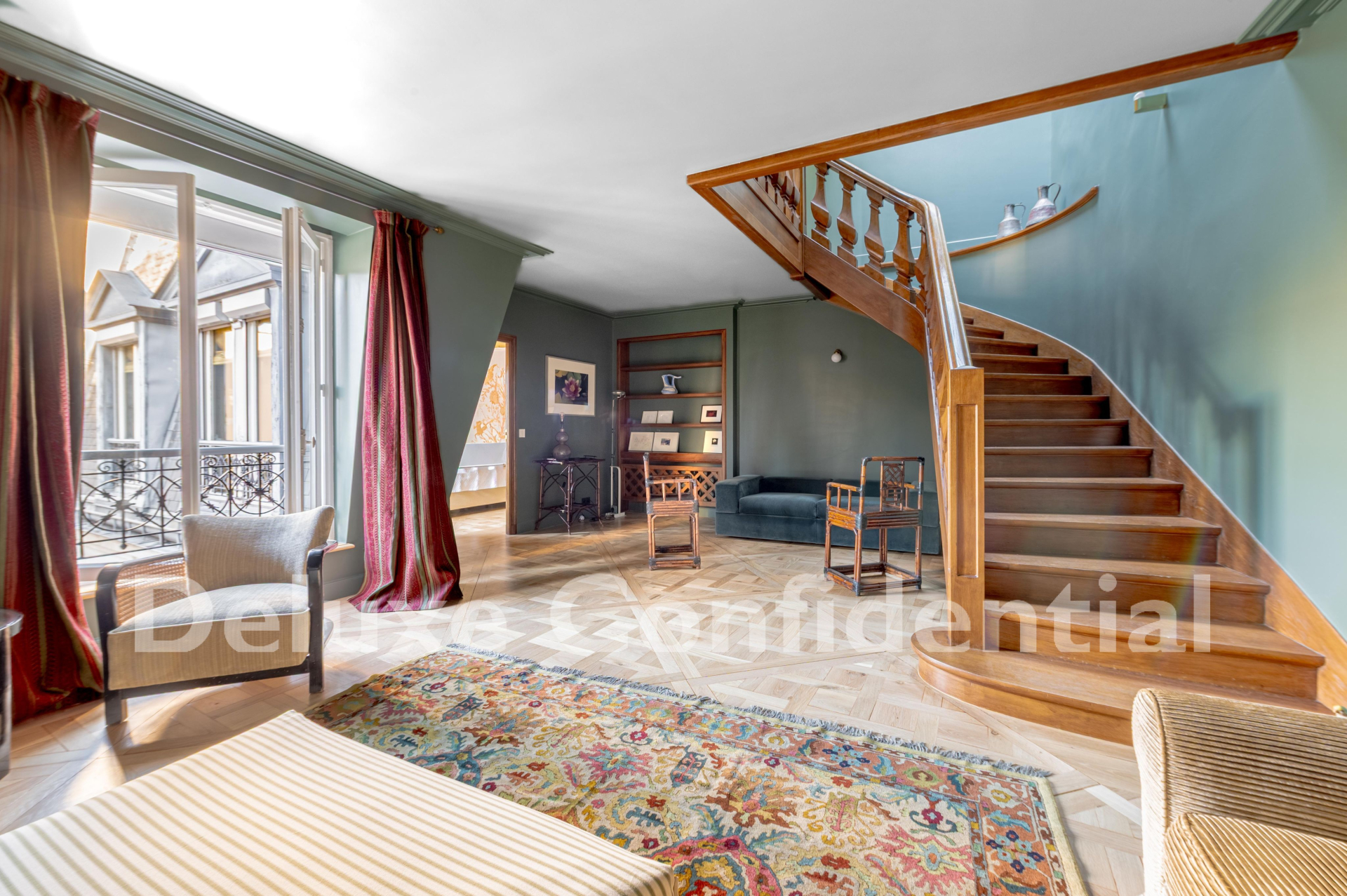 The sixth floor is connected by a wide, elegant internal staircase with a skylight.