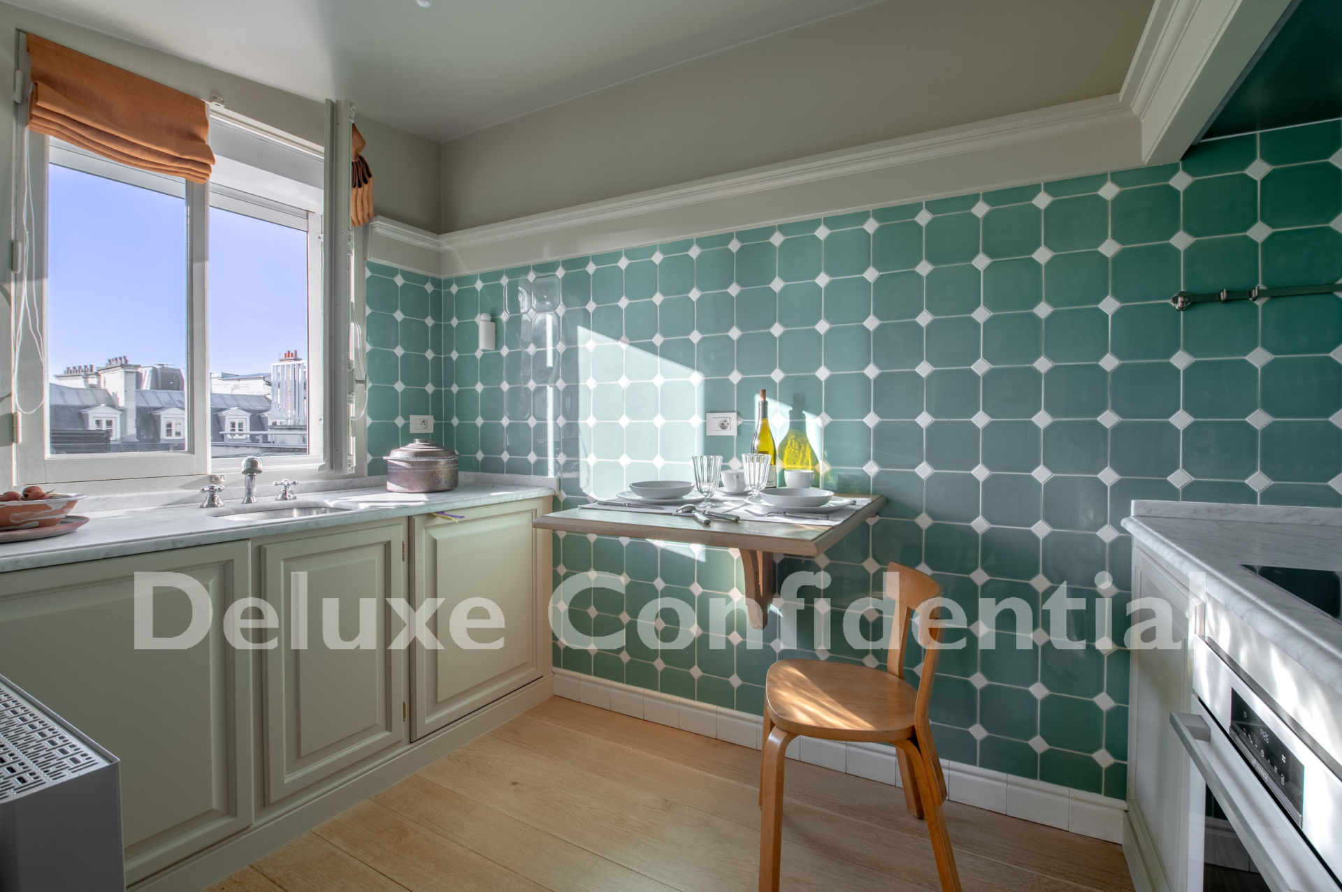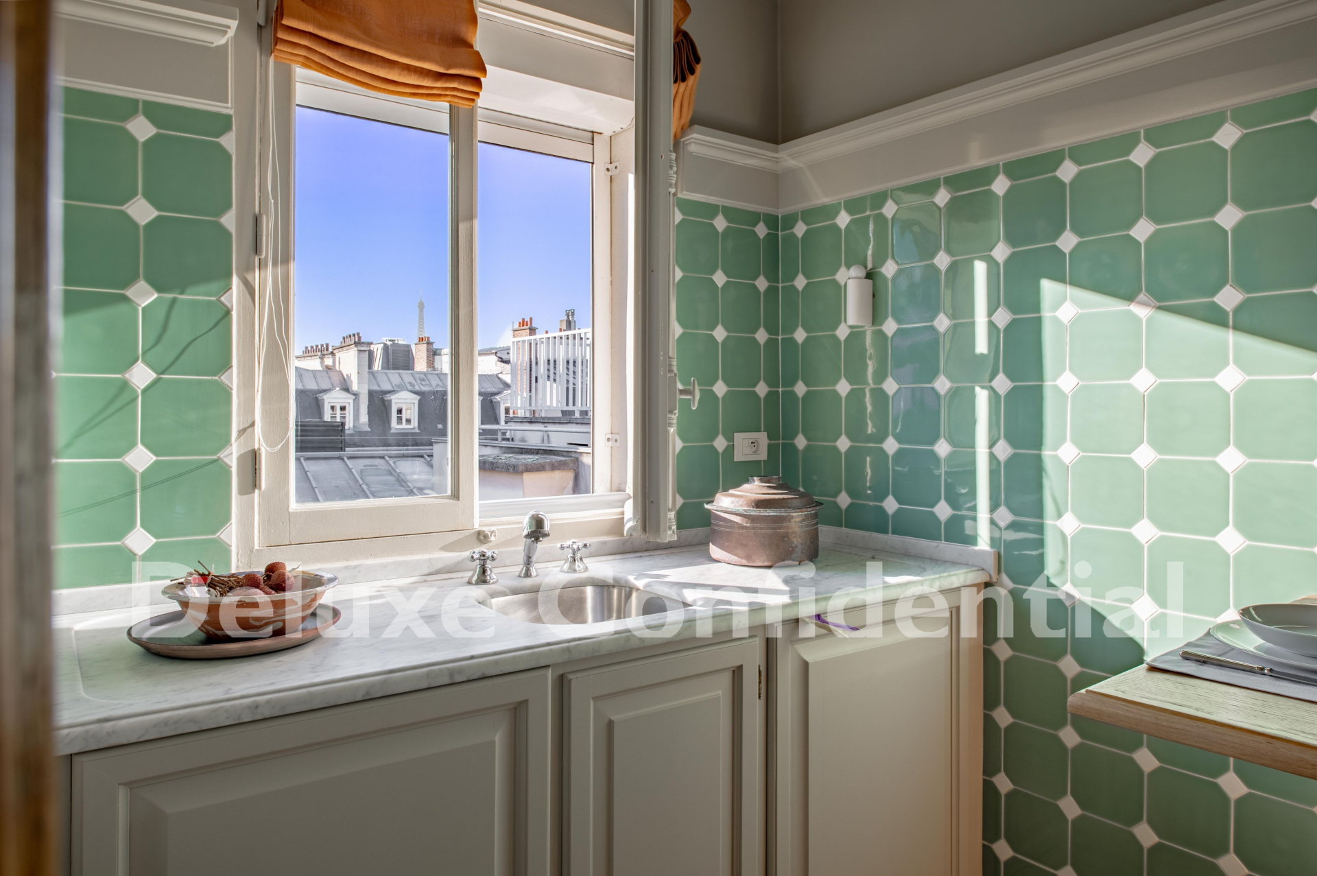 A dining room adjoining the fully equipped kitchen with a view of the Eiffel Tower